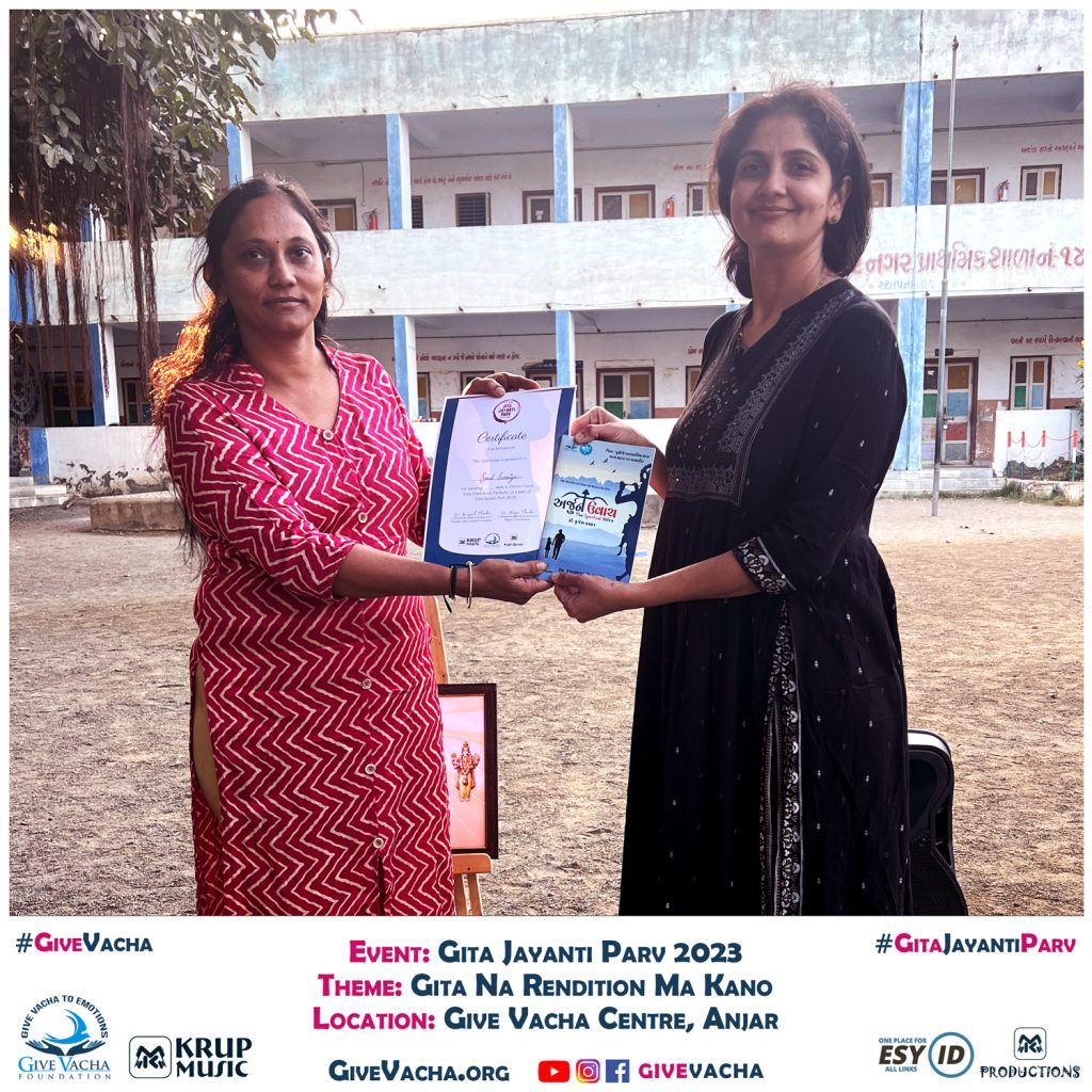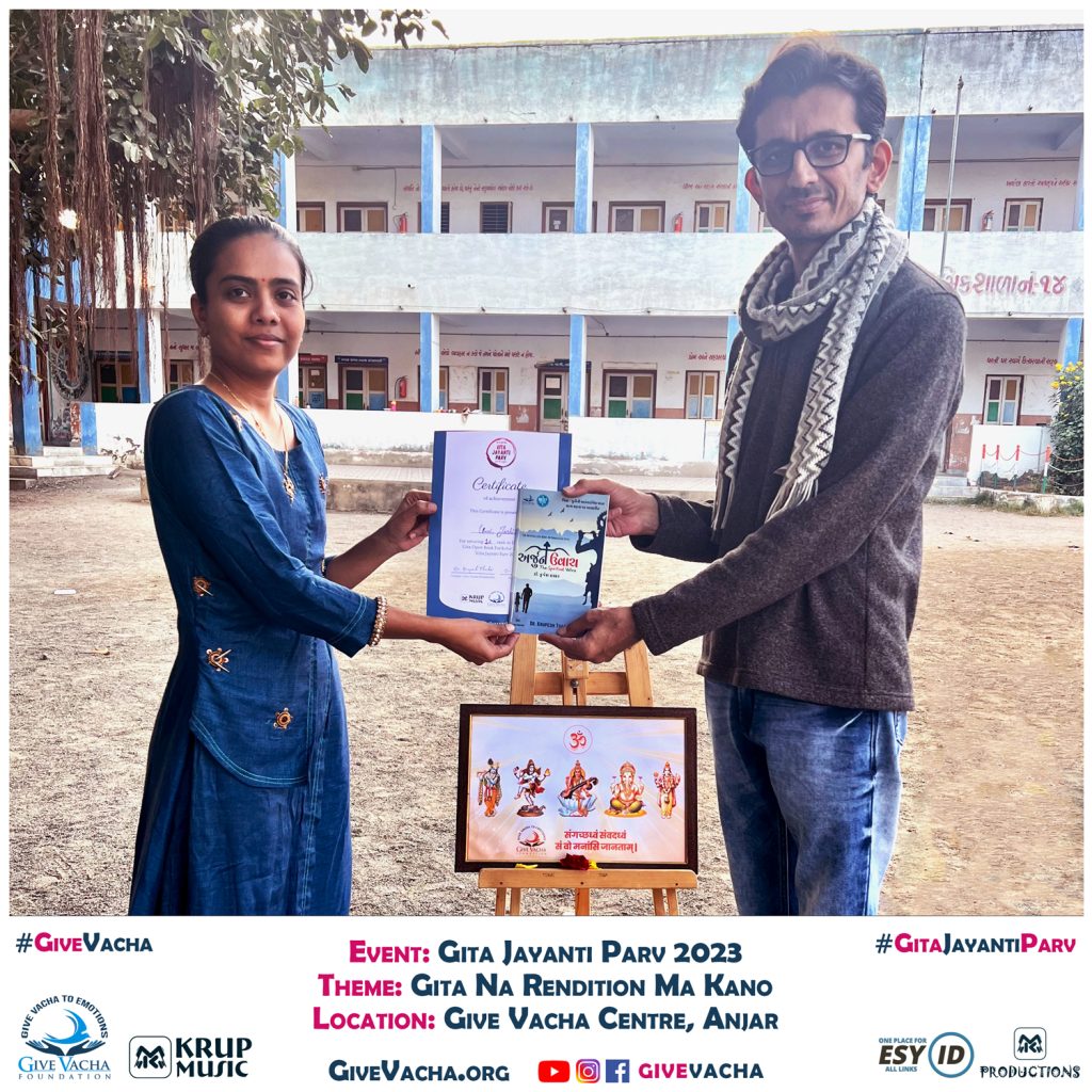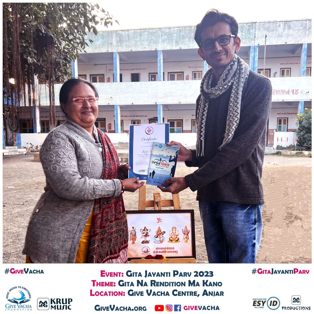 “Gita Jayanti Parv 2023,” spearheaded by Dr. Krupesh Thacker at Give Vacha Foundation, is an extensive initiative dedicated to disseminating the profound teachings of the sacred Bhagavad Gita, known as the holy book of mankind. This unique endeavor stands out as the longest Gita Jayanti Festival globally, spanning a month in anticipation of Gita Jayanti each year. Throughout this month-long celebration, diverse activities centered around the Bhagavad Gita are organized, including Gita Recitation sessions featuring the Parv Fusion Band in the captivating “Gunje Gita” show and an Open Book Bhagavad Gita Exam.