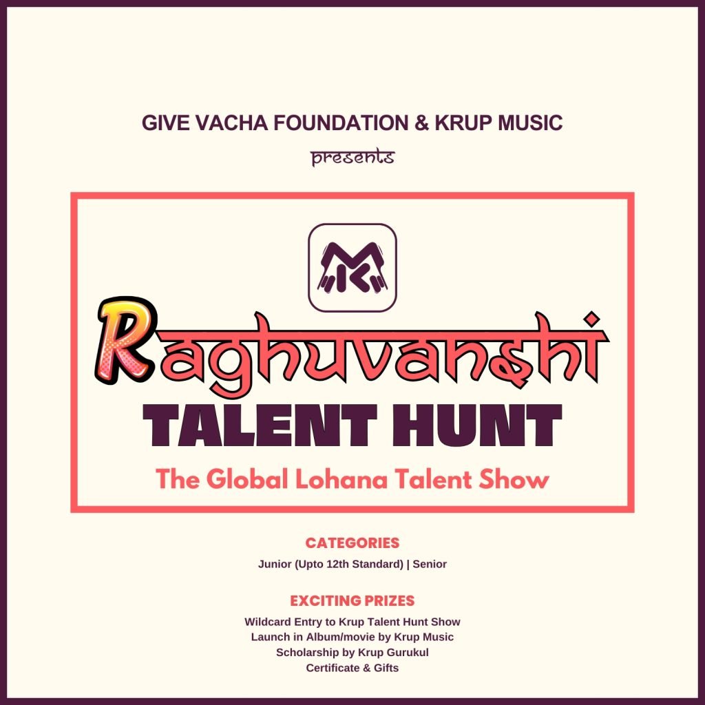 Raghuvanshi Talent Hunt is a prestigious platform exclusively designed to spotlight the extraordinary talents of the Lohana community. Organized by Krup Music and Krup Productions, in collaboration with Esy ID and the Give Vacha Foundation, this event celebrates cultural pride and artistic brilliance within the community. It is part of the Krup Talent Hunt.